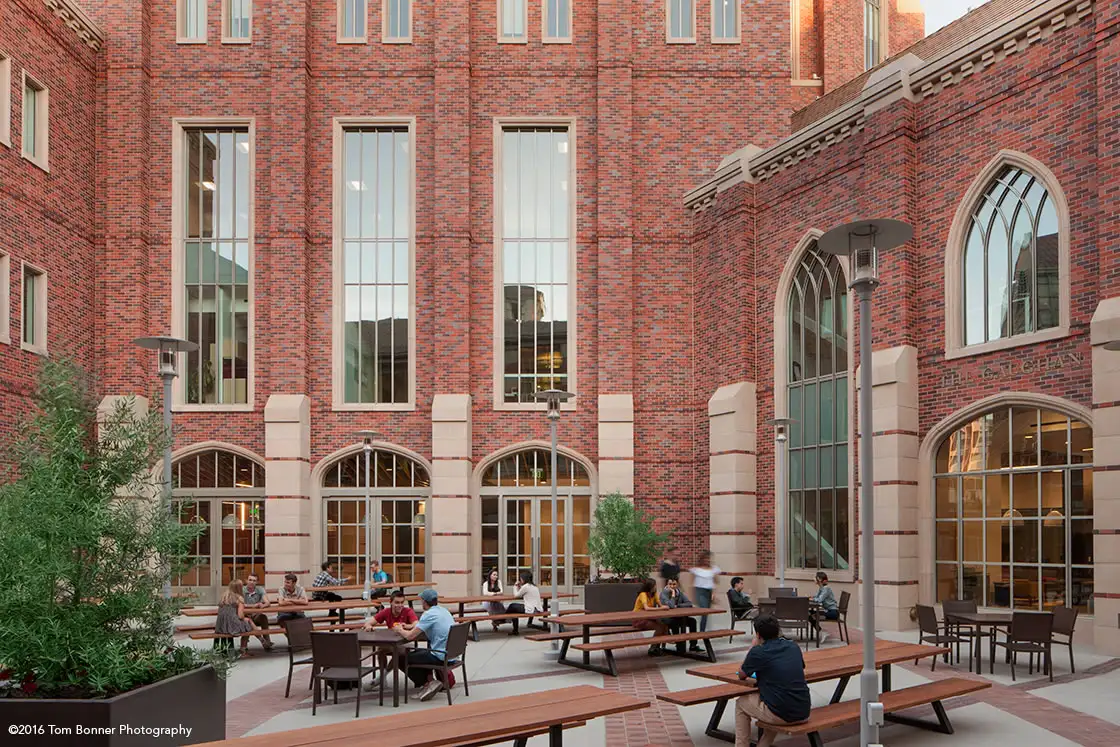 Jamestown175 Series windows and 5000 Series doors were installed in the new Jill & Frank Fertitta Hall, the undergraduate facility of USC's Marshall School of Business. Hope’s solid hot-rolled steel can sustain the load requirements of such large windows, custom-shaped to achieve the desired Gothic style.